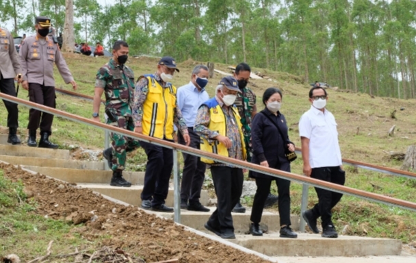 Dari Menara Pandang, Puan lalu melanjutkan peninjauan ke lokasi Bendungan Semoi Sepaku dengan menaiki helikopter bersama Panglima TNI dan jajaran menteri.